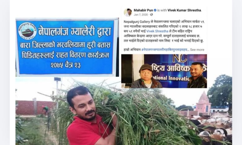२०७५ सालमा बारामा आएको विनाशकारी हावाहुरीले जनजीवन तहसनहस पार्दा, धेरैले समाचार मात्र पढे— तर बिवेक कुमार श्रेष्ठ राहत, सद्भाव र मानवीय संवेदना बोकेर स्वयं फिल्डमा उत्रिए। ‘नेपालगन्ज ग्यालरी’ मार्फत देखिएको उनको सक्रिय भूमिका आज पनि जनताका लागि प्रेरणाको स्रोत बनेको छ।