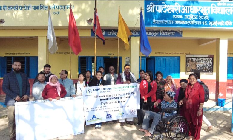 नेपालगन्जमा पछिल्लो समय सामाजिक कार्य गर्दै आइरहेको गोपाल निना फाउन्डेसन नेपालले आज शुक्रबार नेपालगन्ज उपमहानगरपालिका वडा न. १८ भुजइ गाउँ स्थित श्री पाटेश्वरी आधारभुत विद्यालयलाई पाँच थान वाइड बोर्ड , १ थान ह्ववील चियर र विद्यार्थीहरुलाई चाहिने विभिन्न सामग्रीहरु हस्तान्तरण गरिएको हो ।