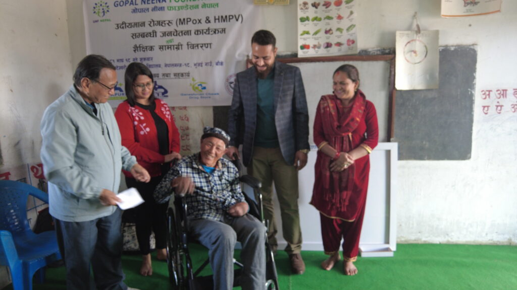 तेस्तै श्री पाटेश्वरी आधारभुत विद्यालयका ६,७,८ का विद्यार्थी र शिक्षक शिक्षिकालाई मंकीपक्स र एचएमपिभि रोगको बारेमा सचेतना मुलुक जानकारी , विद्यालय व्यवस्थापन समितिको तर्फबाट ७९ बर्षिय भिम बहादुर क्षेत्रीलाई हृवील चियर हस्तान्तरण भएको थियोे ।